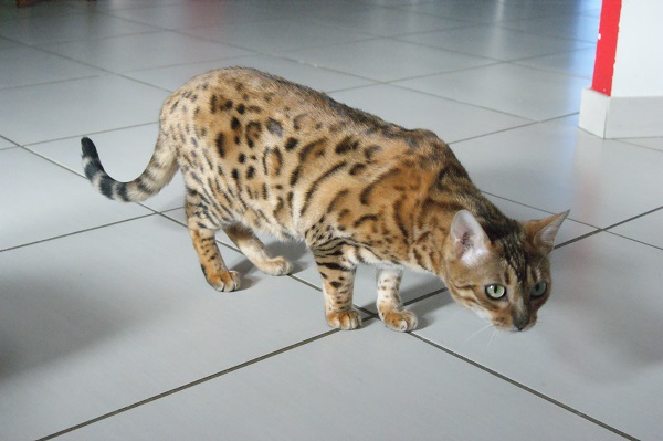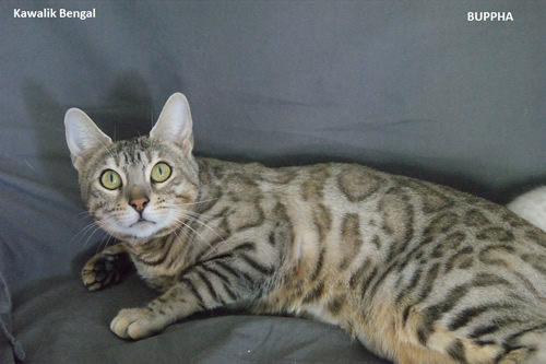 Bunzi est un magnifique bengal de couleur Brown Spotted Tabby, avec de très belles rosettes, une tête sublime avec de beaux verts et un très bon type (avec notamment un joli profil). Il est né au Canada et possède un pédigree TICA.