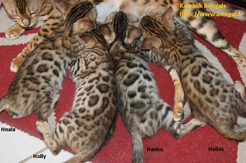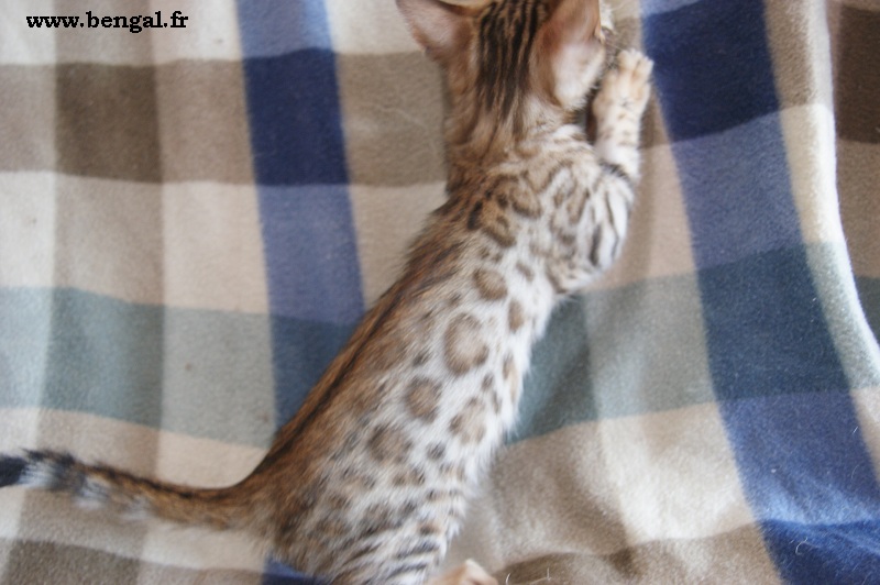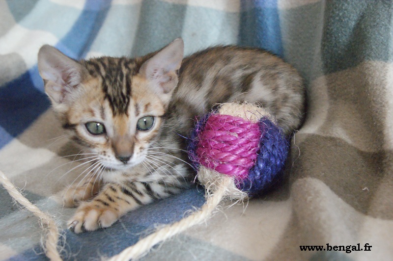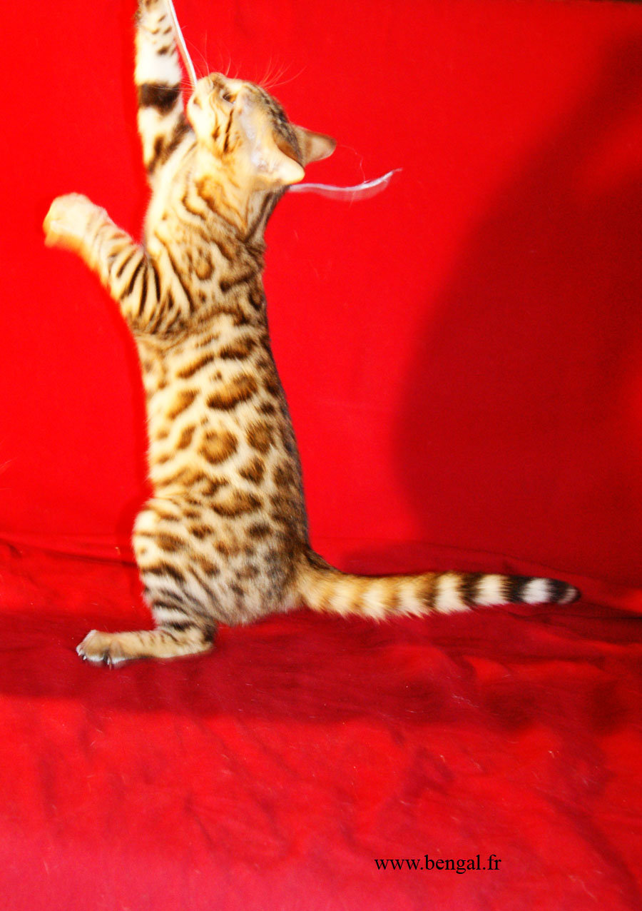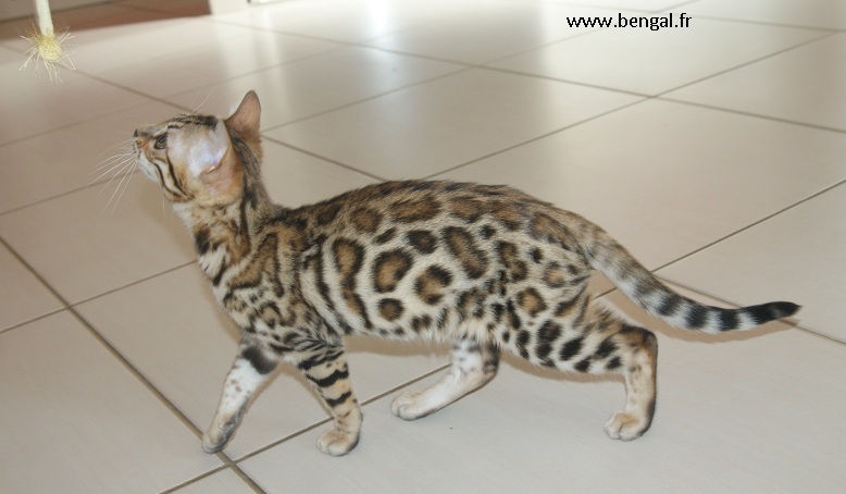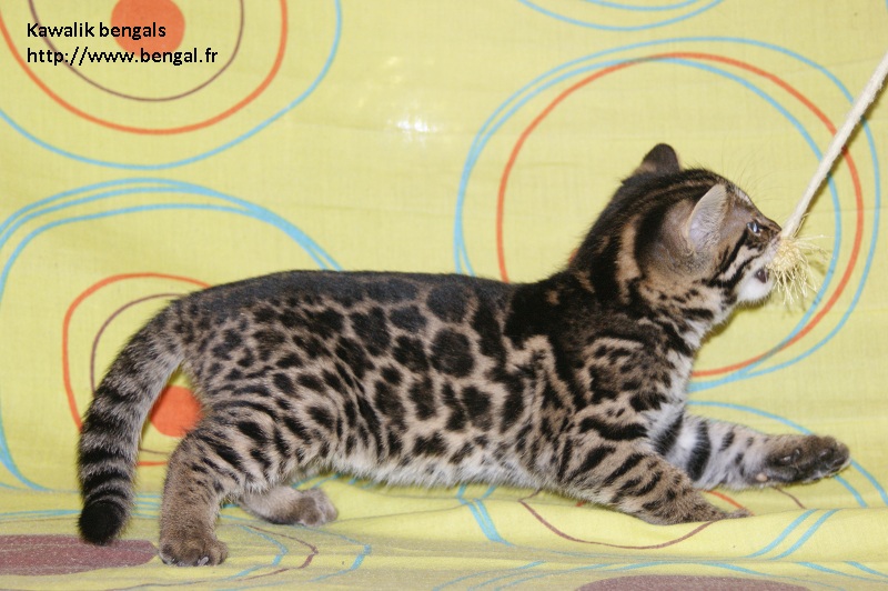 Video d'un chaton né chez nous en 2011 : Vendu _______________________________________________________________________________________________________________________________________________________________ InformationsLa Chatterie Kawalik (du mont des ânes) est un élevage professionnel et familial. Nous favorisons une socialisation intraspécifique (nous avons d'autres chats non bengals) et interspécifique (à l'homme, bien sûr, maus aussi à d'autres animaux domestiques quand cela nous est possible). Plus globalement, nous tentons d'offrir à nos chatons une grande variété de stimulations. Cette démarche gourmande en temps et en énergie nous permet de proposer aux amoureux du bengal des chats équilibrés, dynamiques et sociables. Nos chats ne vivent pas sous bulle, et nous croyons que cela vaut mieux pour eux...et pour vous ! Dans ce sens, nous ne rendons nos chatons disponibles qu'à l'âge de 12 semaines. Tous nos chatons sont vendus vaccinés (primo+ rappel), , tatoués électroniquement (puce hypodermique), munis de leur pédigrée LOOF et d'un kit chaton. Nous fournissons également attestation de vente et facture. Ils sont tous issus de parents testés négatifs aux FIV et FelV. Si vous souhaitez acquérir un de nos chatons, il vous faudra verser un acompte pour la réservation. Le prix de l'acompte varie en fonction de la qualité du chaton (compagnie, reproducteur, expo..), de 300 à 500 €. Les acomptes sont non remboursables mais peuvent être transférés sur un autre chaton d'une autres portée. Nous avons des possibilités de livraison en France et à l'international Possibilités également de paiements en 3 fois. Pour tous renseignements , réservation ou si vous souhaitez être mis sur notre liste d'attente pour nos prochaines portées (permets d'avoir les premiers choix sur les portées), contactez nous !!