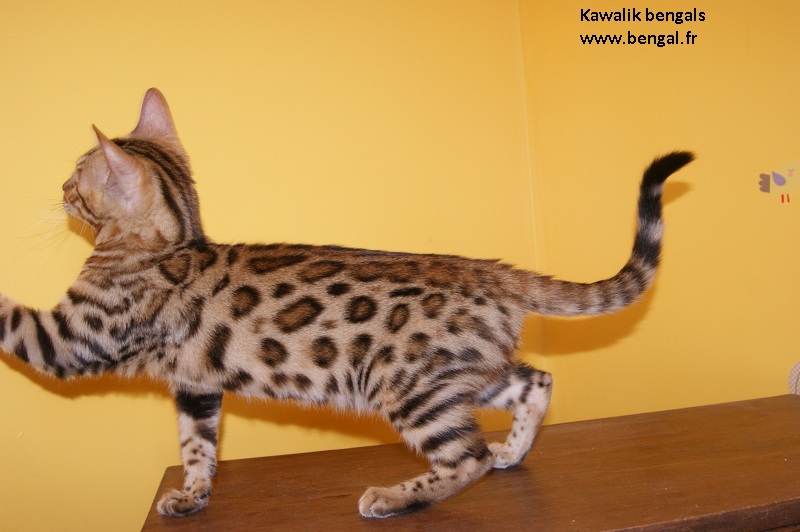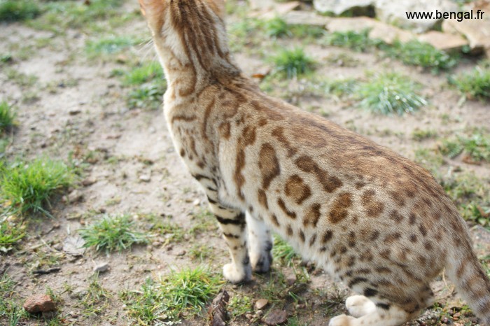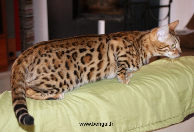 Née le 15 septembre 2011, chez nous. Fille de notre ALC (Korfou) et d'Elixir PKdef normal N/N PKD negative (génétique) Bonbonne est absolument SUPERBE ! Elle a hérité du type sauvage de son papa (profil, petites oreilles arondies, queue épaisse...) mais avec une robe plus rosettée et plus contrastée. Elle est très élancée et musclée. C'est une chatte, enfin pas tout à fait :) très sociable. Elle n'est absolument pas craintive, n'a peur ni de l'aspirateur, ni de mon fils qui est pourtant une grande terreur !! Elle aime.....piquer la viande dans mon assiètte, grimper partout, dormir tout en haut de l'armoire plutôt que sur nos genoux, squater la couverture du chien, courrir après les chatons, et miauler très fort si elle a le malheur de se retrouver seule dans une pièce ! |