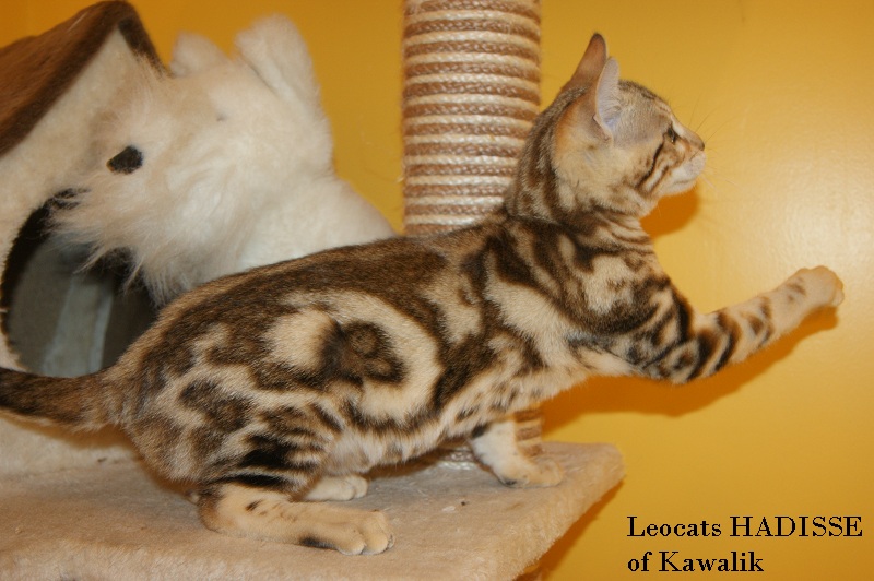 Léocats HADISSE Née le 01/08/2012 Nous sommes heureux de vous annoncer l'arrivée d'une nouvelle petite, prénomée HADISSE Qui nous vient de notre amie Sylvie (Léocat bengal) que je remercie au passage très sincèrement. HADISSE est de toute beauté, une robe marble très hamronieuse, un très bon type avec de belles petites oreilles. C'est une petite femelle très très calîne.