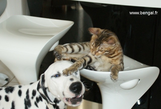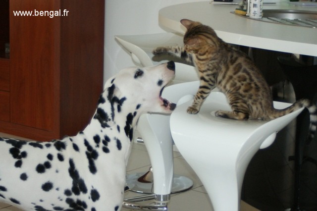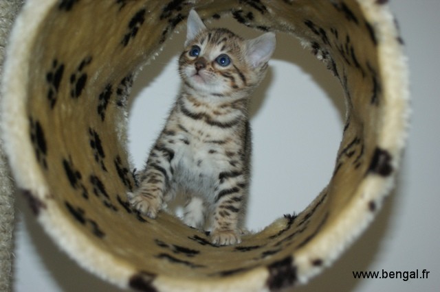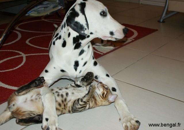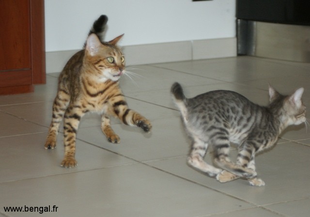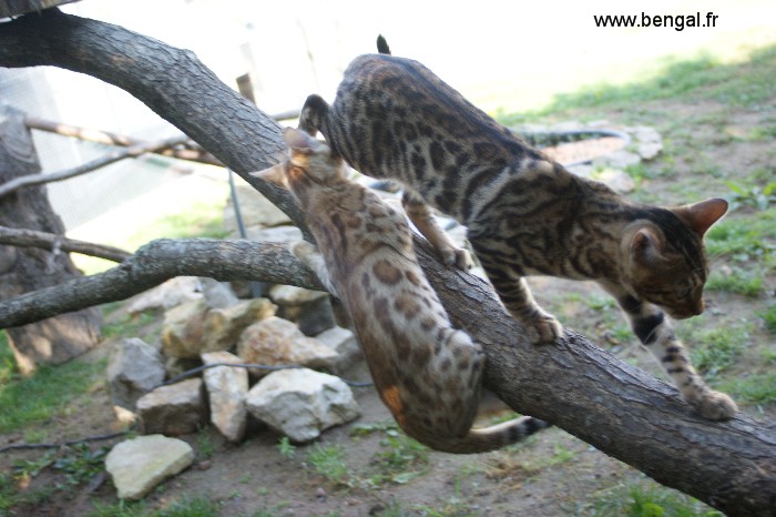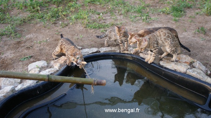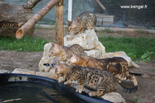 L'élevage étant en plus d'une passion ma profession, nos chats et chatons bénéficient d'une attention toute partIculière journalière. Nos chatons sont manipulés tous les jours. Nous essayons au mieux de les familiariser au bruits de la maison et favorisons les contacts avec d'autres animaux (comme notre chien) mais aussi les enfants. Nous avons une nurserie pour les premières semaines mais rapidement, ils sont élevés au contact de nos autres bengals. Nous accordons beaucoup d'importance au BIEN-ETRE de nos reproducteurs adultes et nous avons constuits spécialement pour eux des enclos aménagés, agrémentés d'arbres sur lesquels ils peuvent grimper et d'un bassin (les bengals adorant l'eau !)